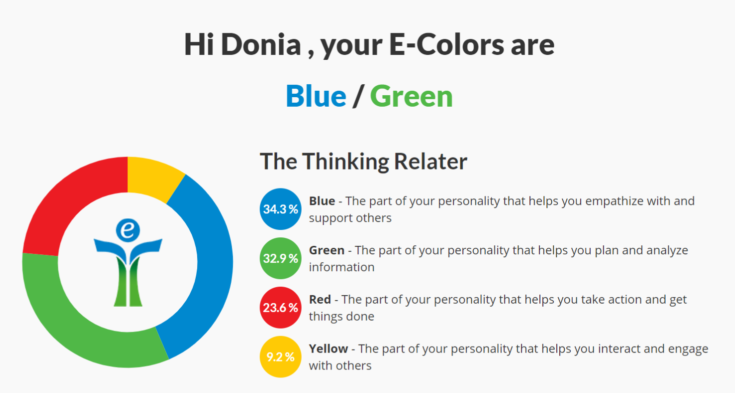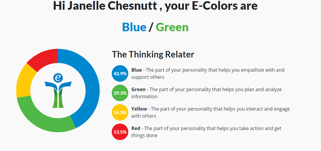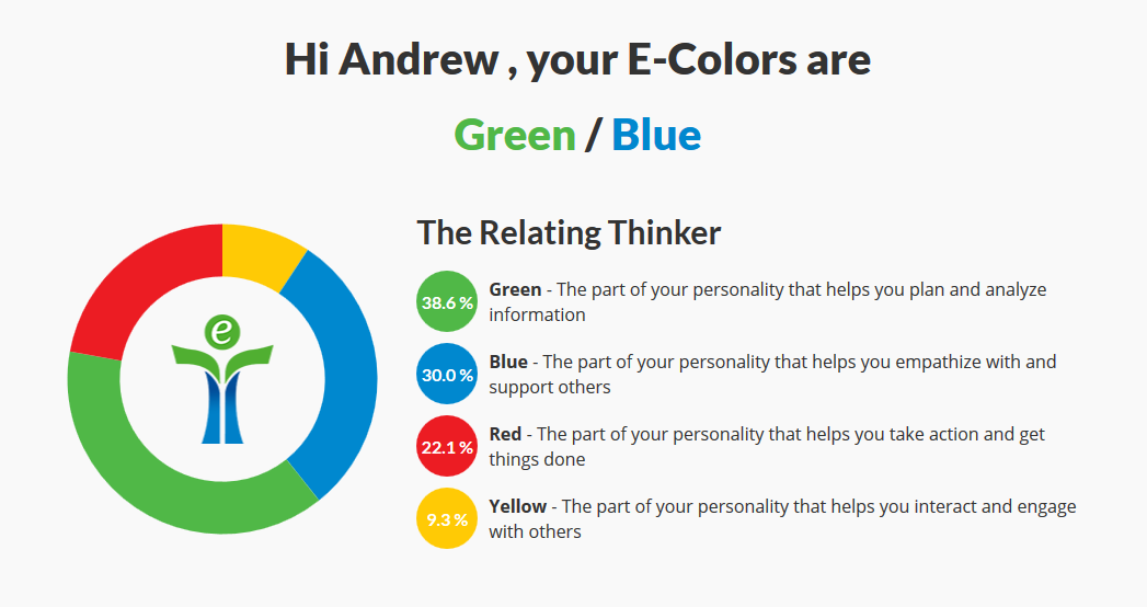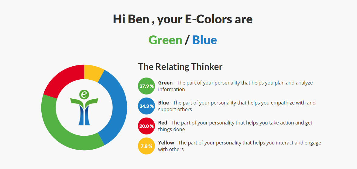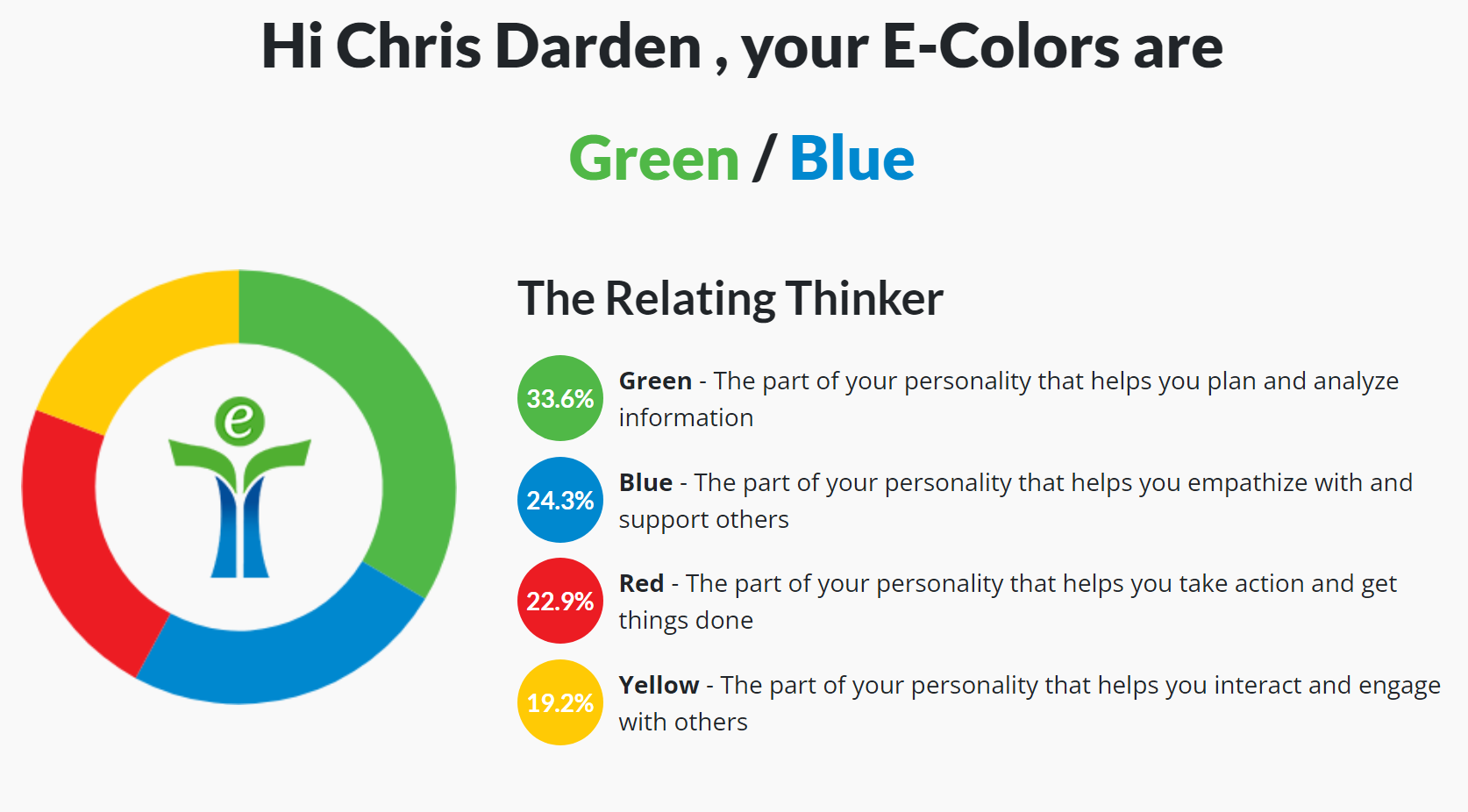 My primary E-Colors are Green over Blue, which means my personality style is that of the Relating Thinker.