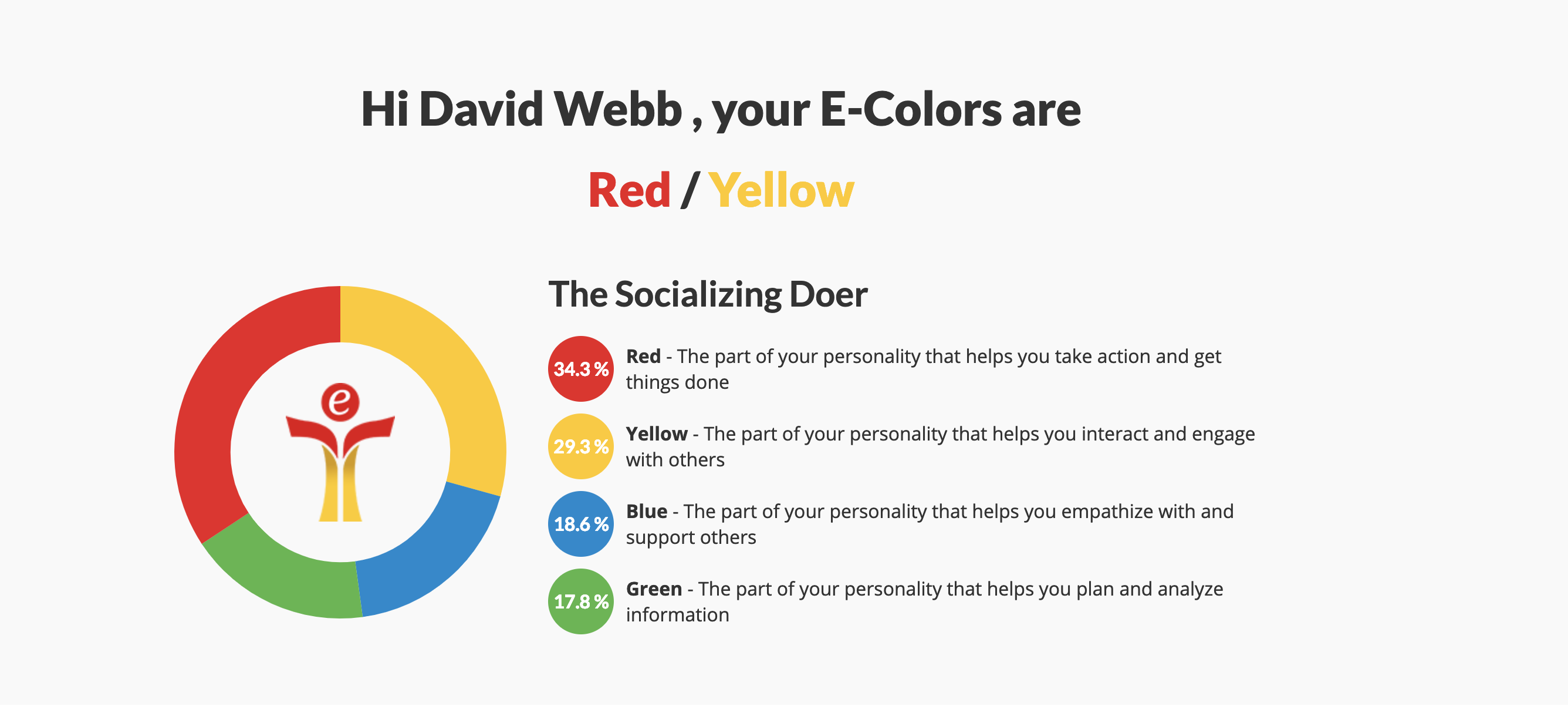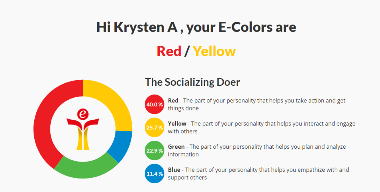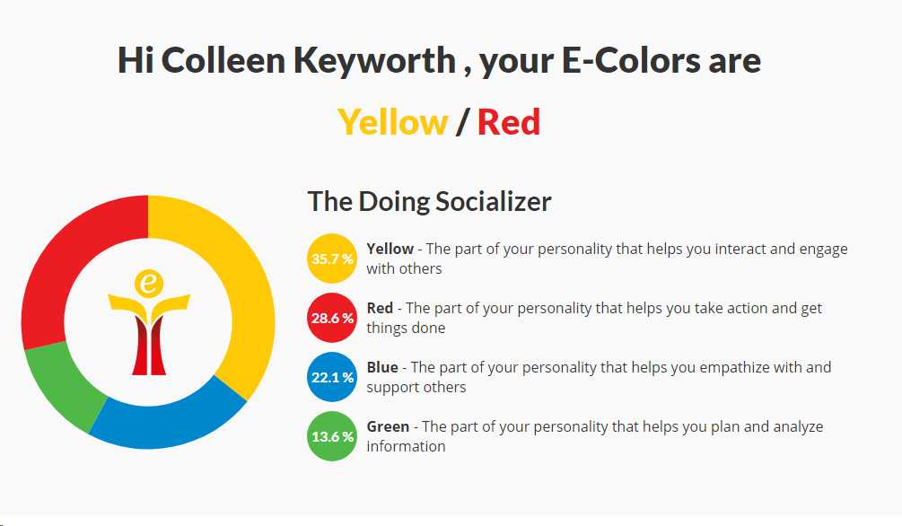 My primary E-Colors are Yellow over Red, which means my personality style is that of the Doing Socializer.