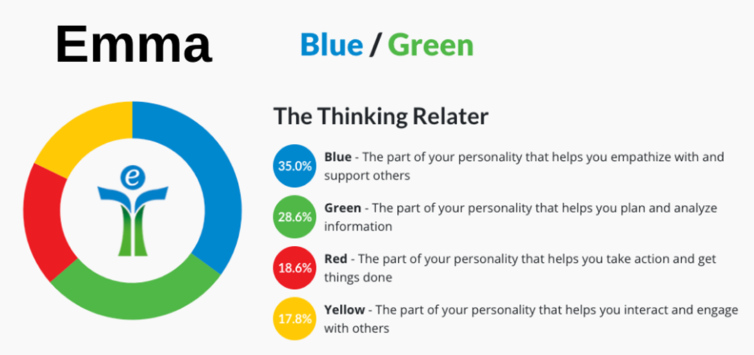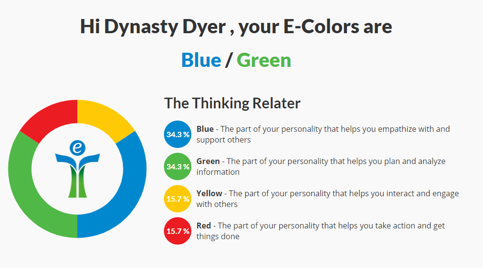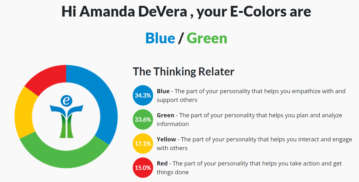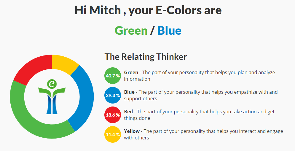 My primary E-Colors are Blue over Green, which means my personality style is that of the Thinking Relater.