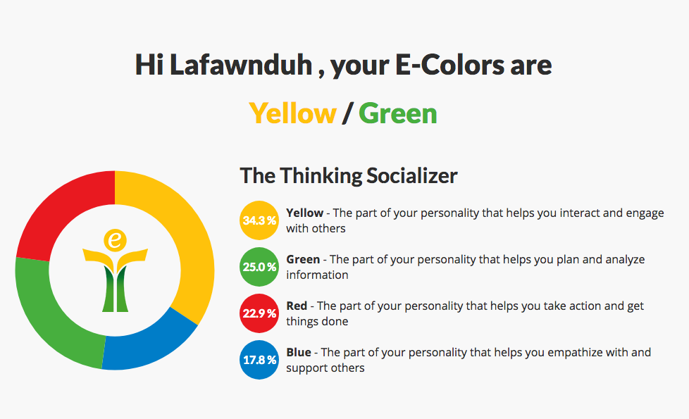 My primary E-Colors are Yellow over Green, which means my personality style is that of the Thinking Socializer.