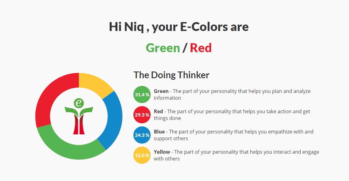 My primary E-Colors are Green over Red, which means my personality style is that of the Doing Thinker.