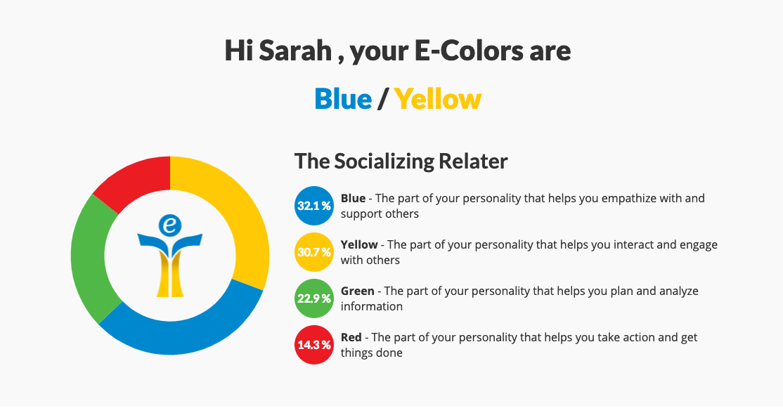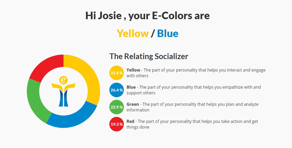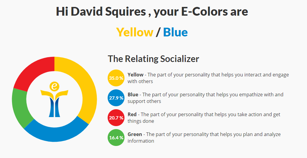 My primary E-Colors are Blue over Yellow, which means my personality styles is that of the Socializing Relater.